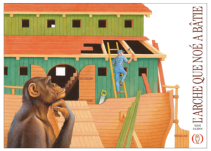 L’arche de Noé est une ressource courante dans la culture d’enfance, surtout à cause des animaux qu’elle a transportés : effet de liste pour s’endormir dans L’arche que Noé a bâtie de Henri Galeron (Les grandes personnes, 2022, chroniqué sur lietje)) , de surprise dans Les Étonnants Animaux que le fils de Noé a sauvés, de Alain Serres et Martin (Rue du Monde, 2001). Ici, c’est tout autre chose, l’histoire se passe à l’époque moderne, sans animaux (ou presque) et l’album vise un lectorat bien plus âgé.